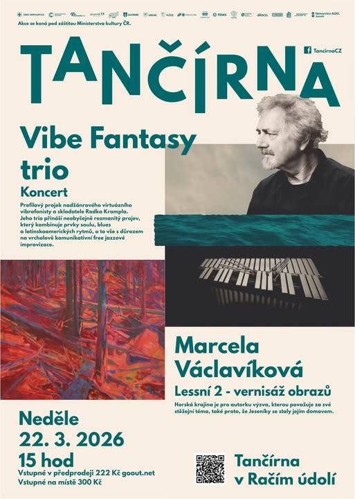 Poslední změna: 08.01.2026 | neděle22.března Radek Krampl - Vibe Fantasy trio - koncert + Marcela Václavíková - Lessní 2 - vernisáž obrazů - Výstavy 22.03.2026 od 15:00 do 16:30 hod. Tančírna v Račím údolí, Javorník | Mapa jazzová a akademická špička poprvé u nás... Tančírna Neděle 22.3.2026 - 15h Předprodej vstupenek GOOUT - 222 Kč Prodej vstupenek na místě - 300 Kč Radek Krampl, žák proslulého pionýra českého jazzu Karla Velebného, je právem označován za nejlepšího českého vibrafonistu. Kramplovu hru zdobí vytříbený technický projev a obrovský cit. Není proto překvapením, že jeho nápaditá a osobitá sóla je možné slyšet na nahrávkách dalších hudebních ikon, jako jsou Meky Žbirka, Roman Dragoun, či kapela Monkey Business. Jeho umělecká dráha je i úzce spjata s ASPM Jana Spáleného, Lubošem Andrštem, Kontrabandem Milana Svobody. Vibe Fantasy je profilovým projektem nadžánrového virtuózního vibrafonisty a skladatele Radka Krampla. Jeho trio přináší neobyčejně rozmanitý projev, který kombinuje prvky soulu, blues a latinskoamerických rytmů, a to vše s důrazem na vrcholově komunikativní free jazzové improvizace. Repertoár tohoto seskupení zdobí jak Kramplovy expresivní a zvukomalebné skladatelské počiny, tak i osobitá pojetí tvorby autorů jako Keith Jarrett, Chick Corea, Wayne Shorter či Ray Charles. Za dobu působení tohoto souboru se Vibe Fantasy stalo synonymem nejen pro originální interpretační spolupráci, ale i inspirací v oblasti kompozice a špičkové improvizace. Jubilejní tour k úctyhodným třiceti letům existence kapely je oslavou instrumentální kreativity a strhujícího hudebního projevu české jazzové legendy mezinárodního formátu. Marcela Václavíková Ak.mal. - TA CO MALUJE Po absolutoriu Akademie výtvarných umění v Praze, kde studovala v malířském ateliéru prof. Radomíra Koláře a prof. Jiřího Sopka se věnuje volné tvorbě, kde malířské vyjádření má prioritu. V každém tvůrčím období, od raných prací až po současnost se dá vystopovat velká a upřímná fascinace přírodou, krajinou a symbolem zvířete. Často bývá označována, jako Ta co maluje koně, ačkoli při bližším pohledu by se už mělo napsat krajinu, kam všechny ty koně patří. Paradoxně se tento motiv v současné práci rozvolňuje do přírodní scenérie, kde cítíme snahu o vyjádření harmonie, řádu a klidu. V horských lesích protnutých divokými potoky, ve skalách a stržích, jen v náznaku tušíme život zvěře a přítomnost člověka. V náznaku dosud nevyřčeném a o to znepokojivějším.Horská krajina je pro autorku výzva, kterou považuje za své stěžejní téma, také proto, že Jeseníky se staly jejím domovem. A tak TA CO MALUJE ,maluje s upřímnou fascinací vše, co ji obklopuje. Vývoj vyjádření se přitom od počáteční zjednodušené znakovosti a symbolické barevnosti posunul k realističtějšímu vyjádření, ve kterém je patrná pokora před velkolepostí horského divadla se syrovými přírodními zákonitostmi a s lovem věčných trofejí…..Nejen v horských krajinách je patrný uvolněný a expresívní rukopis a až grafický kresebný náznak, charakteristický rys, který možná ovlivnilo studium grafiky u prof. Dalibora Chatrného na Střední umělecko-průmyslové škole v Brně. To, co probleskuje v malbě, zůstává patrné i při kresebném vyjádření a také v ilustrační tvorbě.TA CO MALUJE, je svými obrazy zastoupena ve stálých sbírkách Národní galerie v Praze, Veletržním paláci a soukromých sbírkách v České republice a zahraničí. Další výstavy
