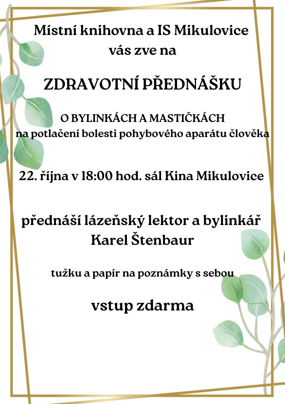 | 22.10.2025 od 16:00 do 18:00 hod. Zlaté Hory kino, Zlaté Hory | MapaPřednáška o léčivých bylinkách. |