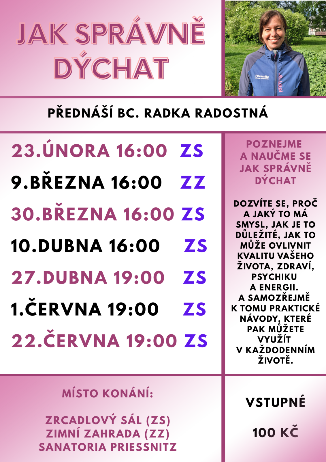 Poznejme a naučme se, jak správně dýchat. Dozvíte se proč a jaký to má smysl, jak je to důležité, jak to může ovlivnit kvalitu našeho života, zdraví, psychiku a energii. A samozřejmě k tomu praktické návody, které pak můžete využít v každodenním životě. Vstupné 100 Kč. Tato přednáška (9.3.2026) se koná v Zimní zahradě Sanatoria Priessnitz (1.patro).