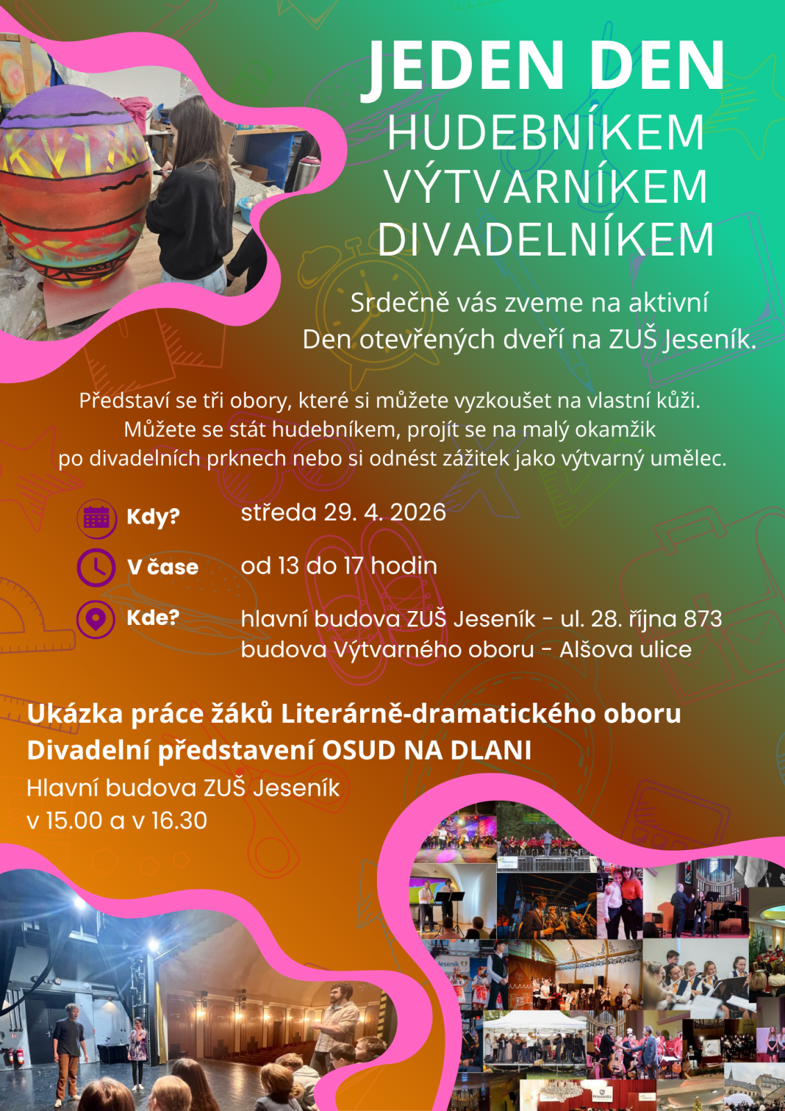 Zveme vás na den otevřených dveří na ZUŠ Jeseník. Budeme se na vás těšit na hlavní budově ZUŠ (ul. 28. října) a v budově Výtvarného oboru (ul. Alšova).