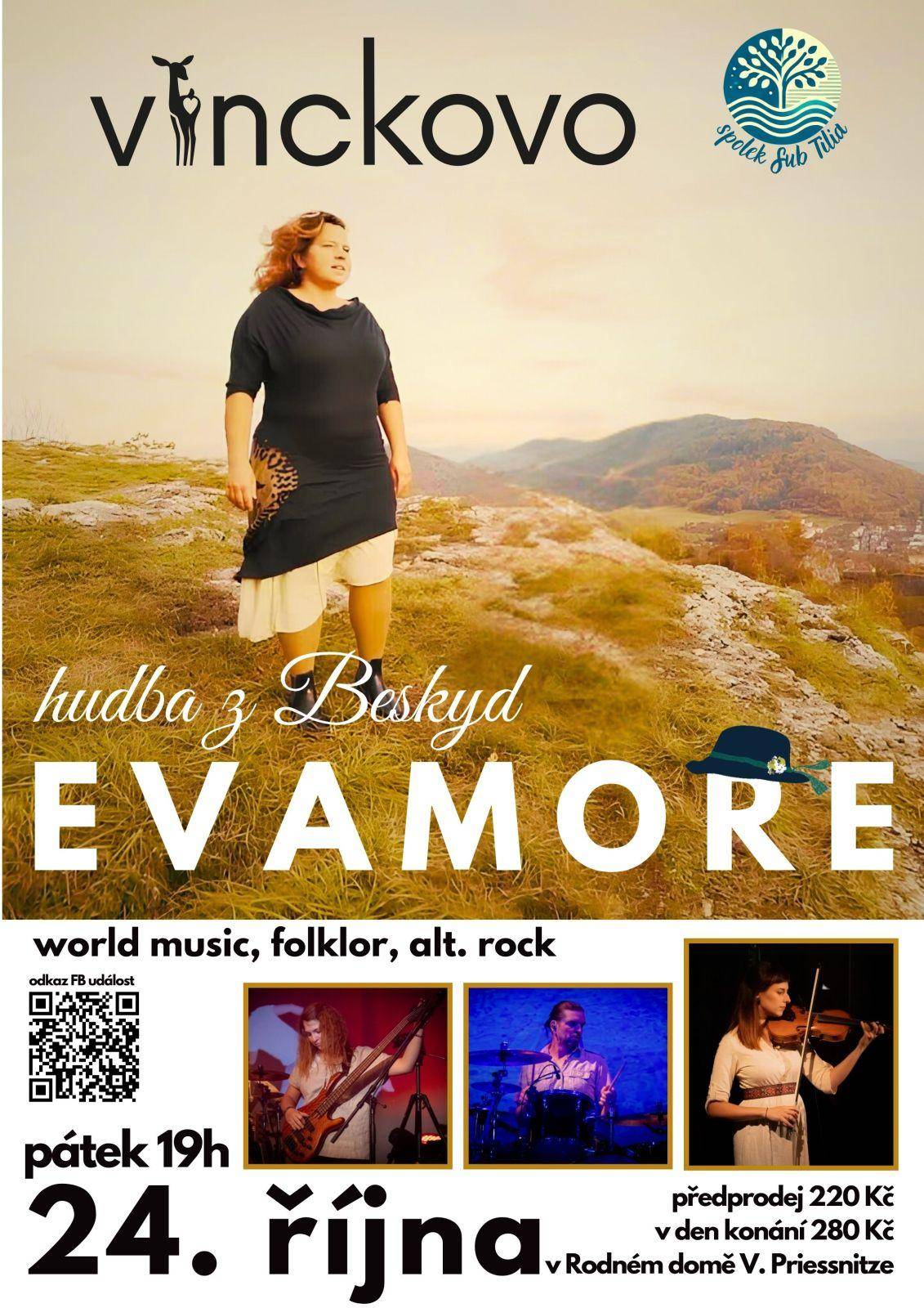 Evamore je pětičlenná hudební skupina z Beskyd, která hraje písně o lásce a beskydské krajině. Vstupné v předprodeji 220 Kč (v kavárně nebo přes qr kód, napište si). V pátek na místě 280 Kč.